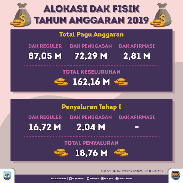 Sebagai informasi, penyaluran DAK fisik tahap I 2019 di Kaltara, jumlah DAK reguler yang tersalurkan sebesar Rp 16.726.207.500, DAK penugasan Rp 2.040.237.000, dan DAK afirmasi terdata belum salur.(humas/YL)